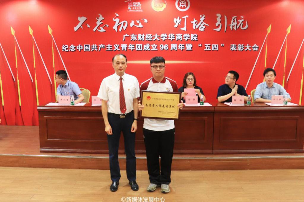 学院团委许娜书记为广东省优秀学生社团“青年志愿者协会”代表何秋虎以及广东省优秀学生干部李世玲、吴嘉宇颁奖。