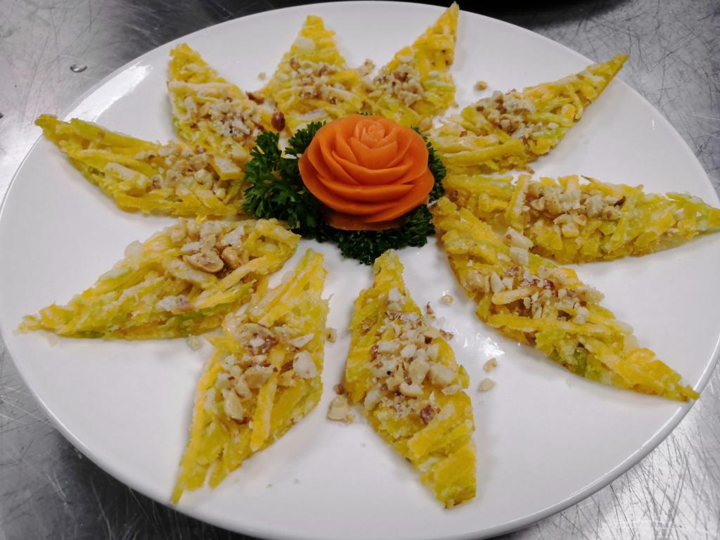 国家中式烹调高级技师、中国烹饪大师、中国金牌总厨、国侨办中餐繁荣基地(广州基地)秘书长李绪彬老师为外籍教师展示和讲解了“咕噜肉”、“醇香金瓜烙”这两道广东特色名菜、名点的做法。李老师精湛的刀工和炉火纯青的厨艺,赢得了领导们的一致肯定,外籍教师们纷纷竖起手指为李老师点赞。