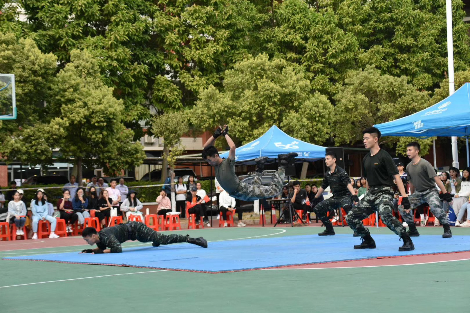 本次大赛共有10支参赛队伍,每支队伍8人。大赛在庄重的迎国旗仪式下拉开了序幕。护旗手昂首挺胸,迈着铿锵的步伐前进。全体起立,在场嘉宾及观众庄严地对国旗行注目礼。