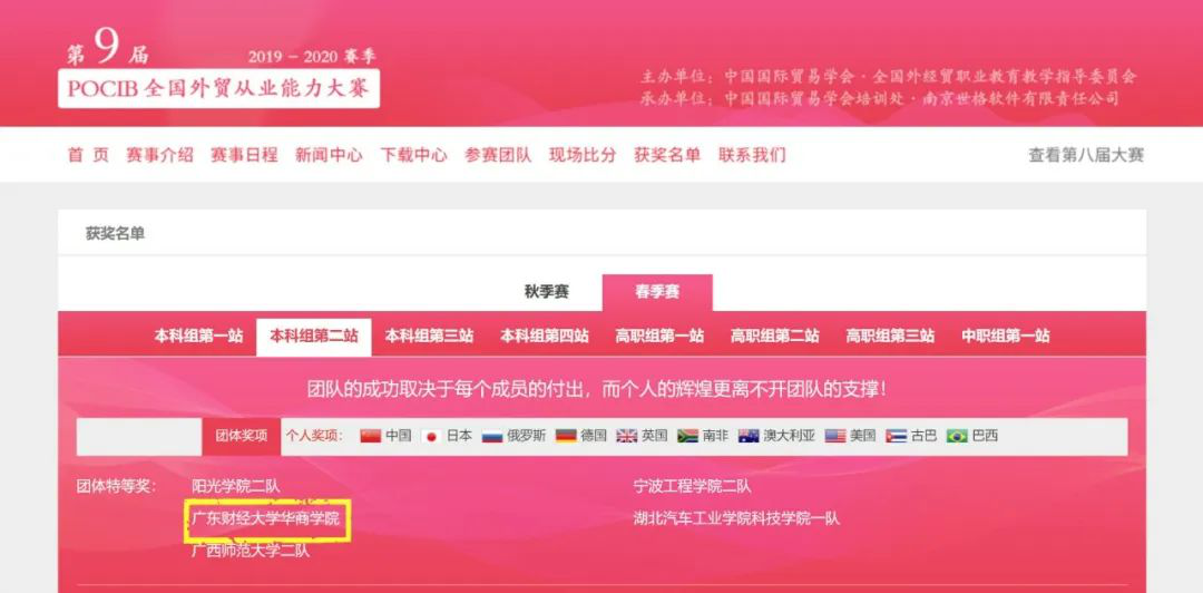 2020年6月18日上午10时,第九届POCIB全国大学生外贸从业能力大赛(春季赛)落下帷幕。本次大赛历时15天,参与角逐的2550名选手分别来自全国的131所院校。我校经济与金融系国际经济与贸易学专业张小玲、岑眉、卢博欢、朱芳仪、张婉仪、陈恩婷、李琪芸、刘琼穗、陈洁玲、廖思婷10名参赛选手在黄丽霞、张文杰两位指导老师带领下,凭借200笔进出口业务,2518封邮件,累计1811小时在线时长,与竞争对手的PK中过关斩将,以团队第三的历史新排名,喜提团体特等奖,并收获个人一等奖2个、二等奖4个、三等奖4个。(个人奖项设置率为40%)