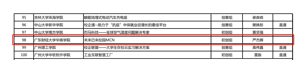 近日,广东省教育厅公布的第六届中国国际“互联网+”大学生创新创业大赛广东省分赛决赛名单中,我校《未来已来校园MCN》项目从全省各高校参赛项目中脱颖而出,晋级决赛,将在8月9日参加省决赛与其他高校共同角逐本届金、银奖。