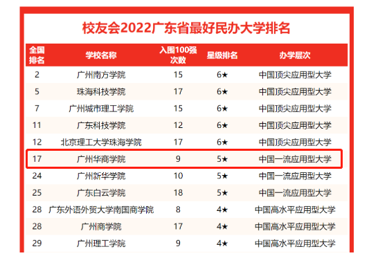 广州华商学院在此次《校友会2022广东省最好民办大学》中全国排名17,广东省位列第6。