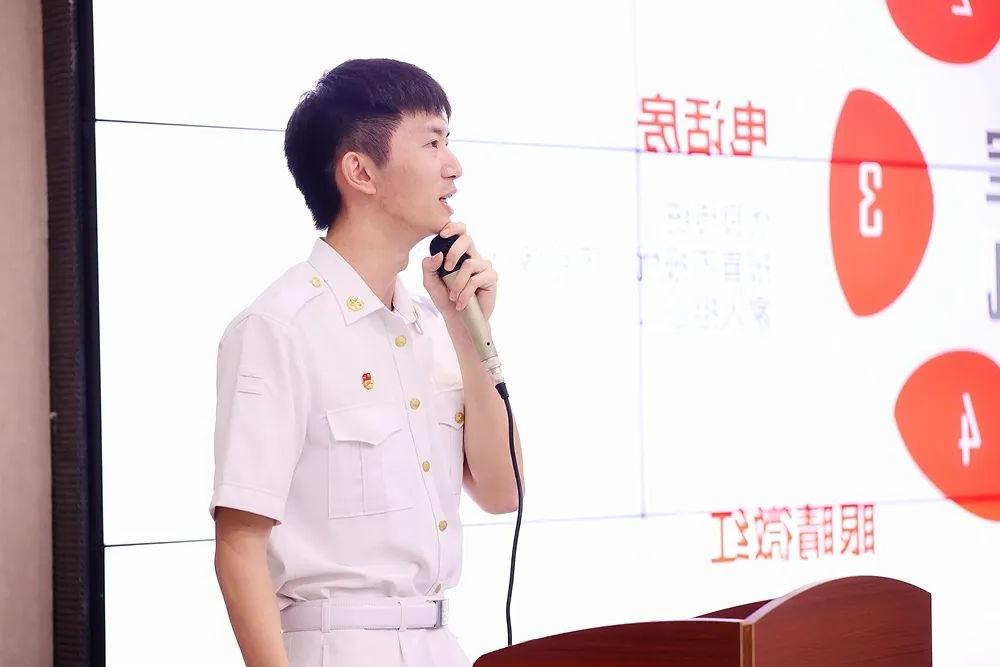 江小龙同学从小对军事感兴趣,萌发了长大当兵的梦想,他希望能在部队中锻炼自我,挑战自己,磨练坚强的意志,锻炼强健的体魄。同时他分享了参与抗洪抢险任务的过程,并对现今大学生服役的政策进行介绍解读。新时代,强军精兵需要新一代大学生的参与,红色基因代代传。最后,他祝愿各位有志青年能够乘风破浪、披荆斩棘早日奔向令人热血沸腾的绿色军营。