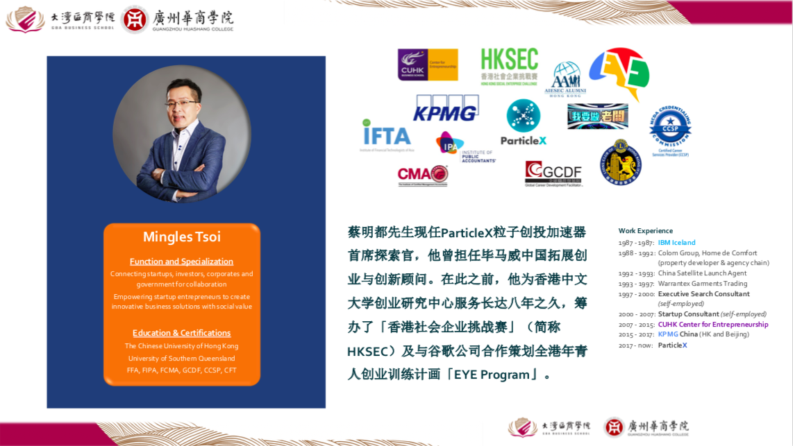 本次大型公益系列讲座由广州华商学院与大湾区商学院(香港)主办,活动得到香港都会大学、广东金融学院、岭南师范学院、广州南方学院、广州新华学院、粤港澳大湾区青年职业发展促进会等40余所粤港澳高校、粤港澳社会组织协助与支持,自2022年4月以来,每隔2-3周推出一讲,所有十讲在2022年12月完成。主讲人为粤港澳知名创业型学者、业界翘楚、创业成功人士。讲座采取腾讯会议和微博同步直播的方式线上举办,后期将陆续推出第七讲《创业比赛经验分享》等其他主题的系列讲座。讲座预告相关信息将在广州华商学院微信公众号等媒体同步刊出。
