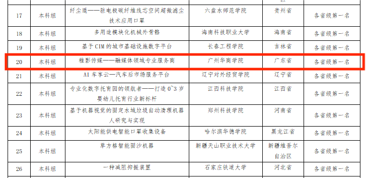 4月18日,中华职业教育社公布第六届中华职业教育创新创业大赛全国总决赛网评成绩名单。广州华商学院“稚影传媒——融媒体领域专业服务商”项目以广东省第一名入围全国现场总决赛。