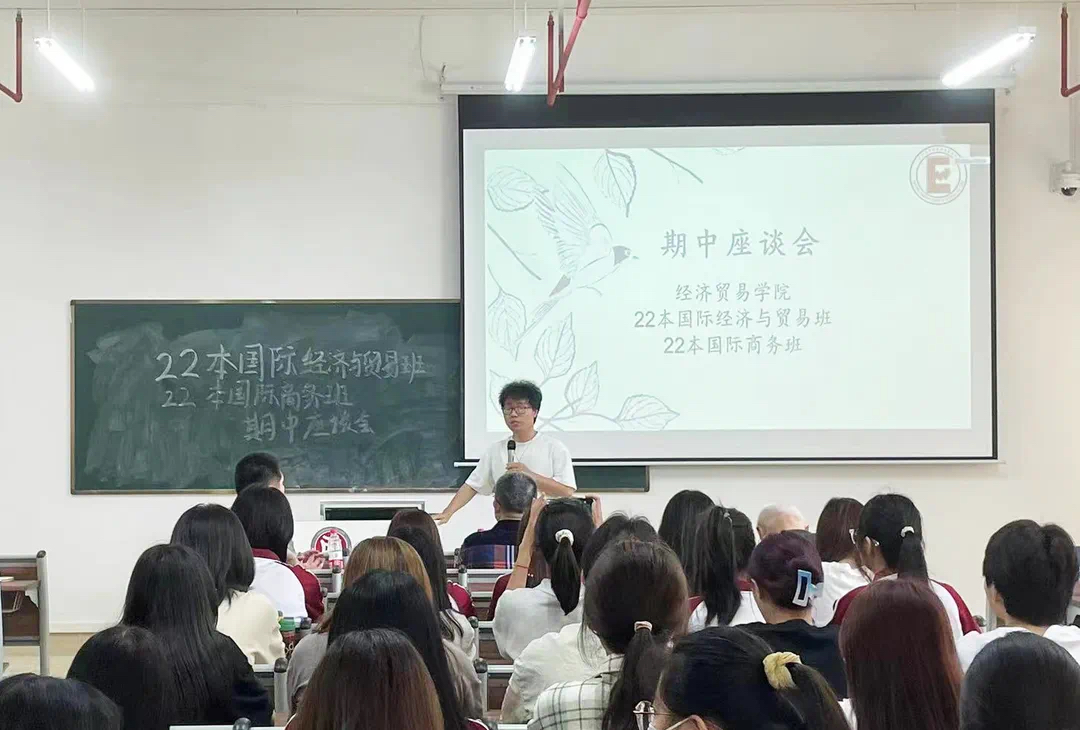 为深入开展学习贯彻习近平新时代中国特色社会主义思想主题教育,坚持立德树人初心,牢记为党育人、为国育才使命,促进经济贸易学院班风学风建设,深入了解四会校区经贸学子的学习情况与校园生活状态,经济贸易学院李广明院长率学院院长助理石立副教授、学工办主任宋元跃老师、各系负责人和教师代表于2023年5月9日前往四会校区,在22级国际经济与贸易班、跨境电商班、国际商务班、经济统计学班分别召开期中座谈会。
