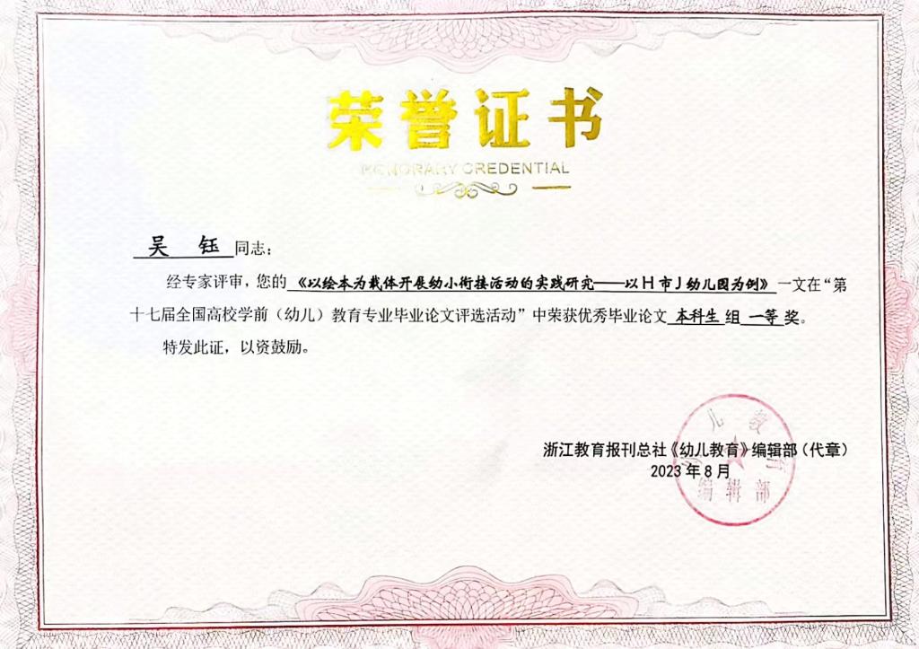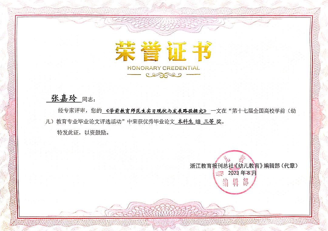 近日,由浙江省教育报刊总社《幼儿教育》编辑部主办的第十七届全国高校学前(幼儿)教育专业优秀毕业论文评选活动结果揭晓。广州华商学院教师教育学院学前教育专业选送的论文分别荣获本科生组一、二、三等奖。