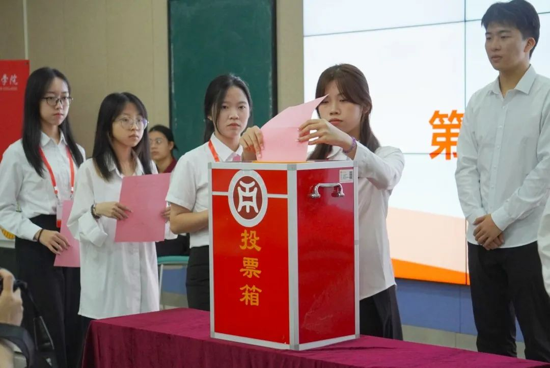 在正式选举广州华商学院教师教育学院第三届学生会委员会委员的环节中,各学生代表在监票人的监督下,庄严地将自己的选票投入投票箱。