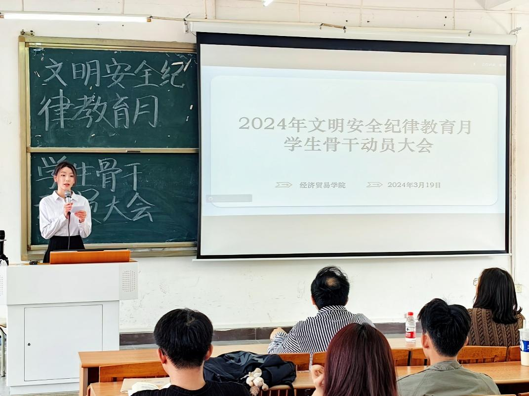 为进一步推进2024年文明安全纪律教育月活动有序开展,提高广大学生的自律守纪意识,规范学生的行为举止,增强纪律观念、安全防范意识,形成良好的校风、学风、班风。经济贸易学院于3月19日下午2:00分别在广州校区励志楼C403、肇庆校区8号楼109召开2024年文明安全纪律教育月学生骨干动员会。