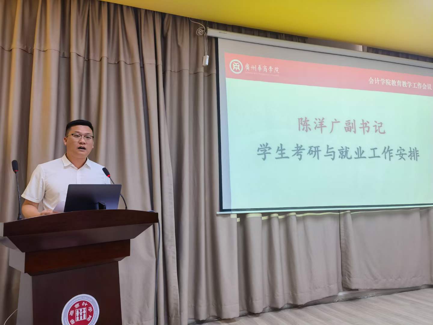 学院党委副书记陈洋广宣读了《中共广州华商学院会计学院委员会关于调整基层教工党支部架构的决定》,决定撤销会计学院教工党支部建制,增设会计学院教工第一党支部、会计学院教工第二党支部与会计学院教工第三党支部。另外,陈洋广副书记报告了2024届毕业生考研和就业情况,提出考研激励措施,鼓励学生积极考研,同时也要求辅导员和指导老师做好学生就业指导及就业信息登记工作。
