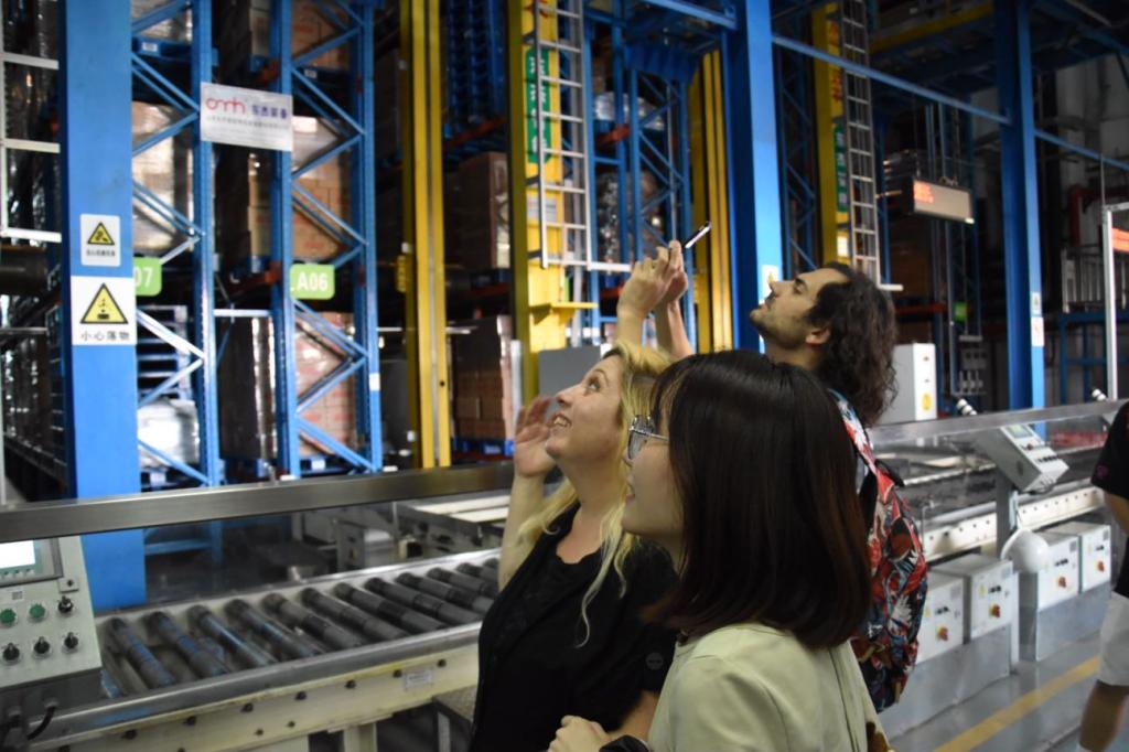 随后,大家来到了占地7400平方米、层高22米的高架立体无人仓库,高大的机械映入眼帘,滚轮带动着货物在各个货架间有条不紊地运行,并能实现自动温控和物联网查询,师生们纷纷赞叹科技进步和全自动化管理。