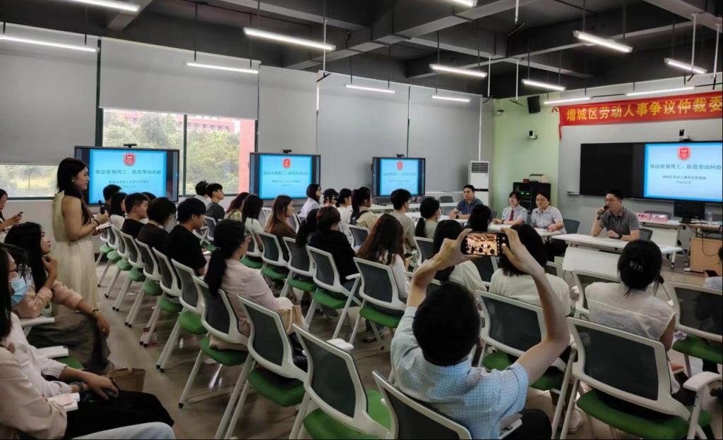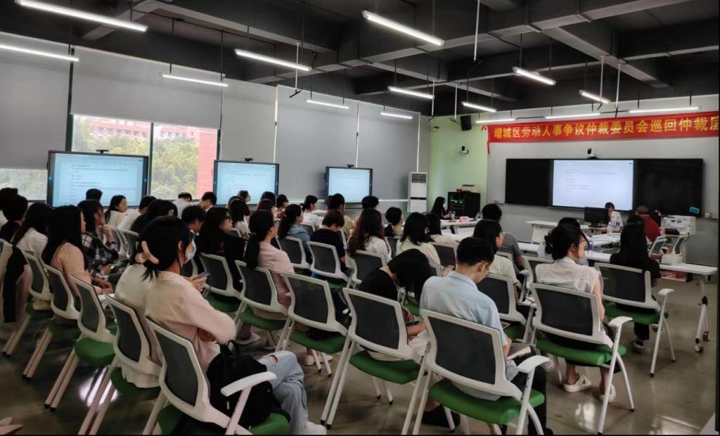 随着仲裁员、书记员、申请人、被申请人准备就绪,巡回仲裁庭首案正式开庭。来自校外企业方、华商教育集团、广州华商学院、广州华商职业学院及广东华商技工学校的人事、法务岗人员及人力资源相关专业师生代表逾50人到场观摩学习。庭审现场座无虚席,井然有序。