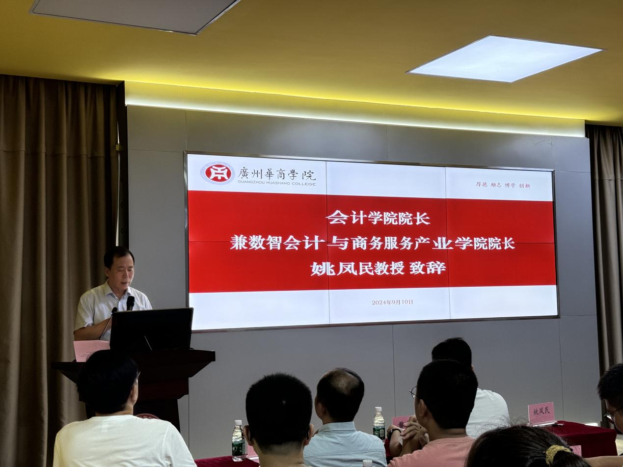 会计学院院长兼数智会计与商务服务产业学院院长姚凤民教授致辞。姚院长代表会计学院全体教师欢迎新同学。他强调,产业班的成立是学院积极响应国家创新驱动发展战略、深化产教融合的重要举措。希望同学们珍惜机会,努力学习,成为华商智能会计的领头雁,发挥示范引领作用。