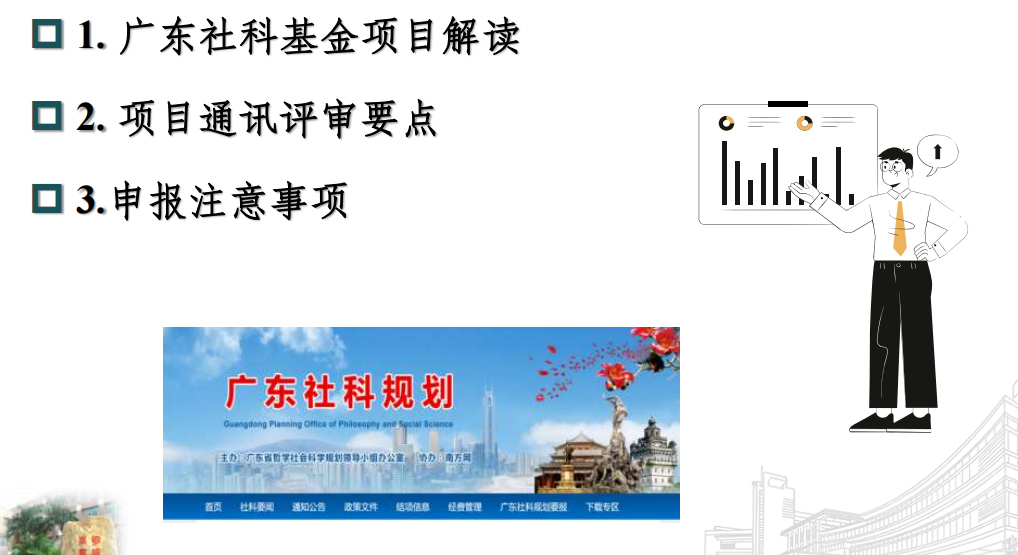 本次经验交流会吸引了来自不同高校和研究机构的科研工作者。会议内容涵盖了广东省社科基金项目的全面解读、项目通讯评审要点以及申报注意事项等多个方面,旨在为参与者提供一个全面、深入的学习平台。
