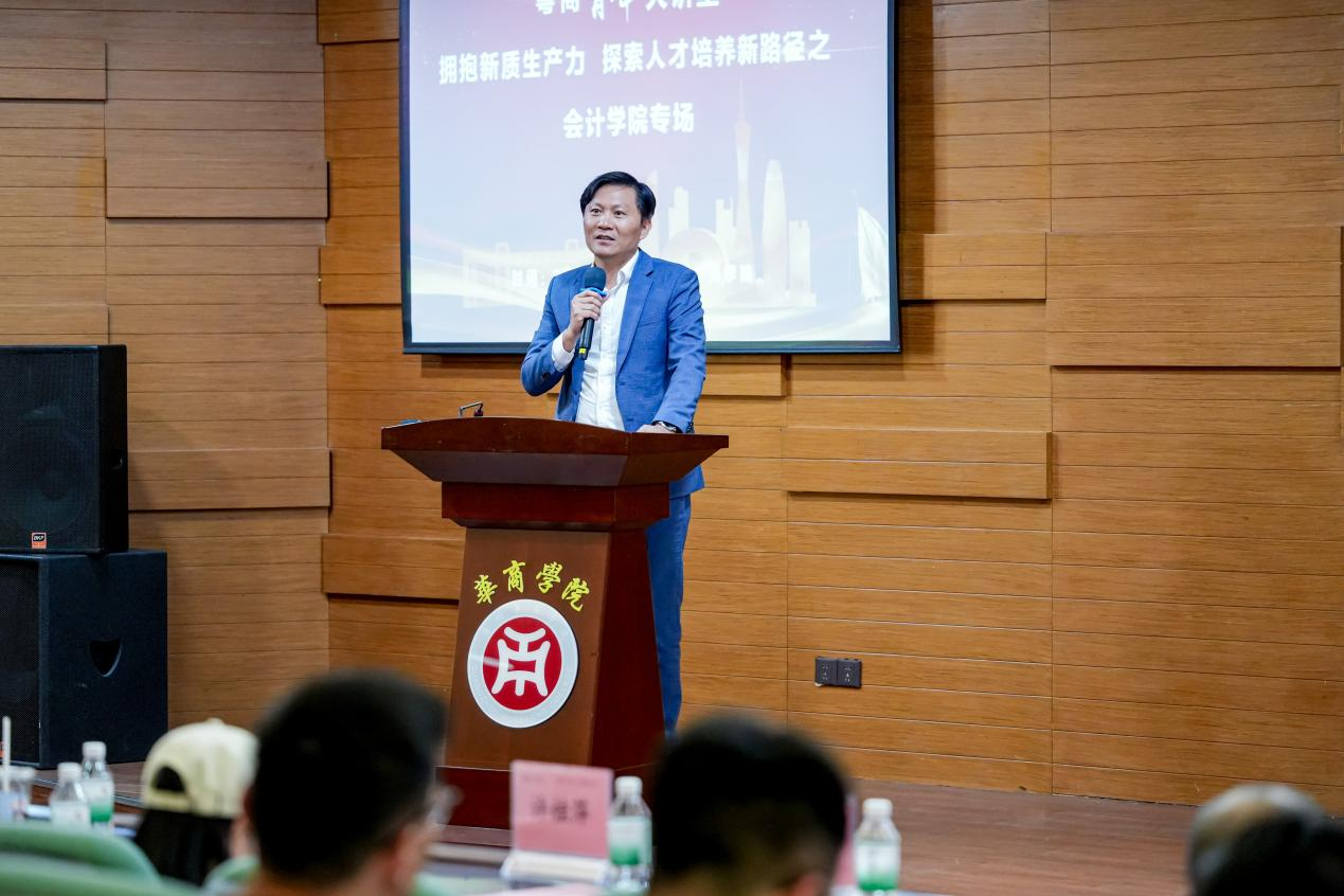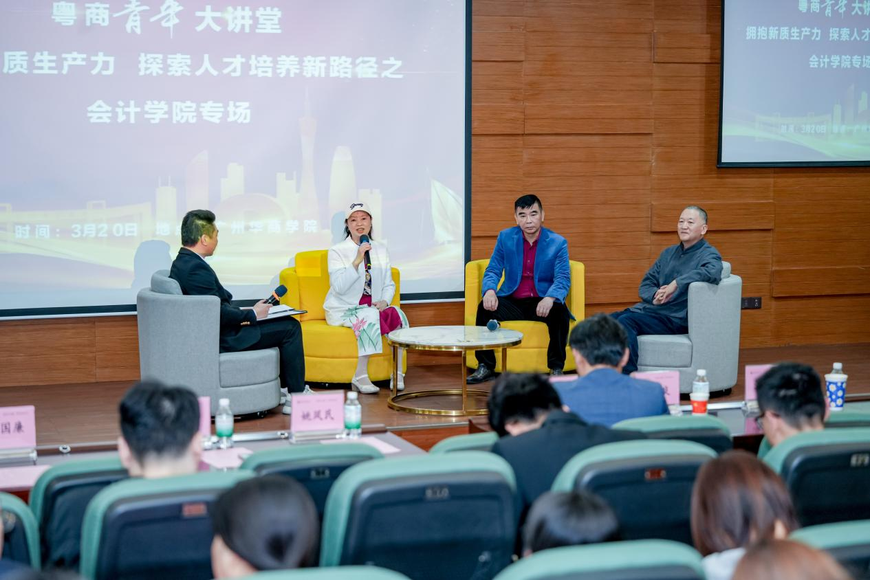 2025年3月20日下午,由广州华商学院主办的《粤商青年大讲堂》之会计学院专场首期活动在图书馆报告厅举行。活动以“拥抱新质生产力,探索人才培养新路径”为主题,汇聚三位跨界商业领袖与多位青年企业家们,为我校师生带来了一场融合科技、人文与商业智慧的深度对话。