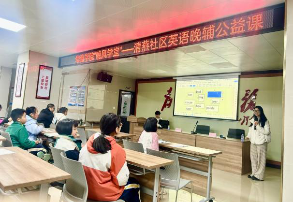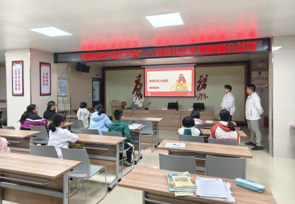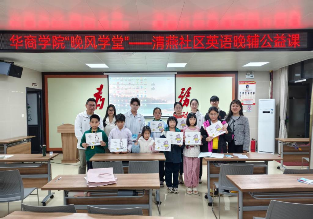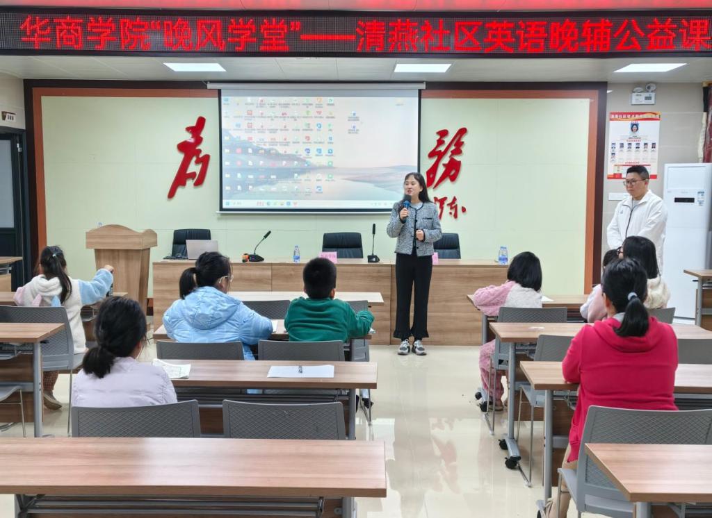 当晚,增城区清燕社区服务站灯火通明,由广州华商学院外国语学院发起的“晚风学堂——华商校社英语晚辅公益项目”首场活动正式启动。清燕社区居委会书记邓镜波同志、外国语学院项目负责人郭宇洁老师及志愿者们共同参与,为社区青少年带来了一场别开生面的英语学习体验。