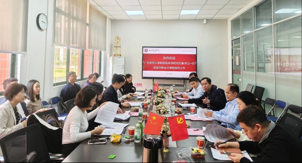 2025年4月3日下午,广州华商学院会计学院与广东财经大学财政税务学院财政系党支部、税务系党支部在会计学院会议室开展联合党日活动。广东财经大学财政税务学院党委书记刘文基一行12人、会计学院院长姚凤民等全院班子成员参加活动,活动由姚凤民院长主持。本次活动通过加强双方院系的党建交流与合作,共同推动财税专业建设及人才培养。