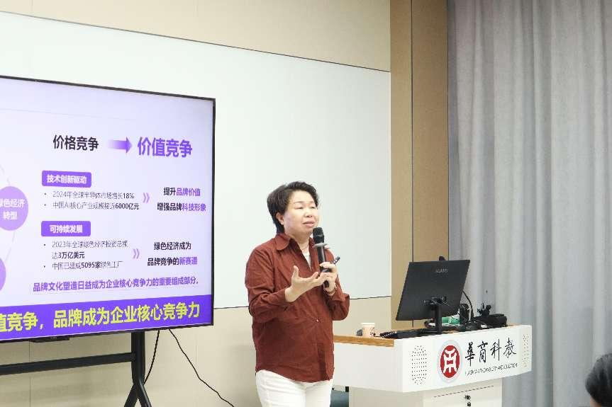 段教授首先介绍了全球市场环境的深刻变化。她指出,随着全球经济一体化的加速,品牌价值、科技形象以及绿色经济已成为品牌竞争的新赛道。她提到,2024年全球半导体市场增长18%,中国AI核心产业规模接近6000亿元,绿色经济投资总额达3万亿美元,中国已建成5095家绿色工厂。这些数据表明,品牌竞争已从单纯的价格竞争转向价值竞争,品牌文化塑造成为企业核心竞争力的重要组成部分。