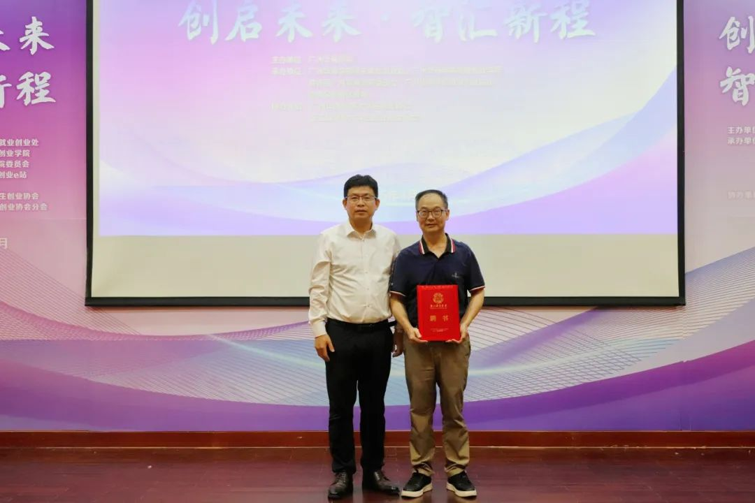 余家军副校长为广州大学创新创业学院院长王满四教授颁发聘书,王满四教授受聘为广州华商学院创新创业导师。