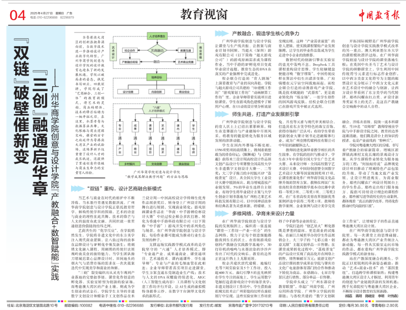 目前,我校创意与设计学院以“人工智能底层逻辑”为指引,通过“学科融合、产业跨界、资源联通”三大战略,成功将传统设计教育转型为智能时代的创意孵化平台,打造出“专业+产业+就业”三位一体的特色人才培养体系。此次得到主流媒体的报道,不仅是对创意与设计学院办学成果的肯定,更彰显了广州华商学院在深化产教融合、服务区域经济发展方面的示范作用。