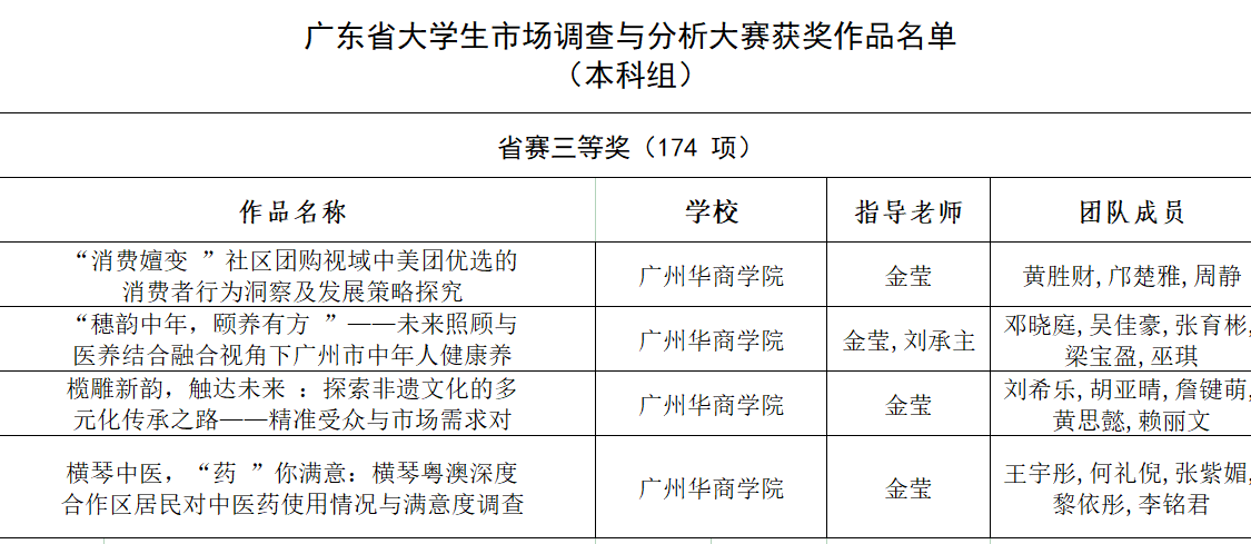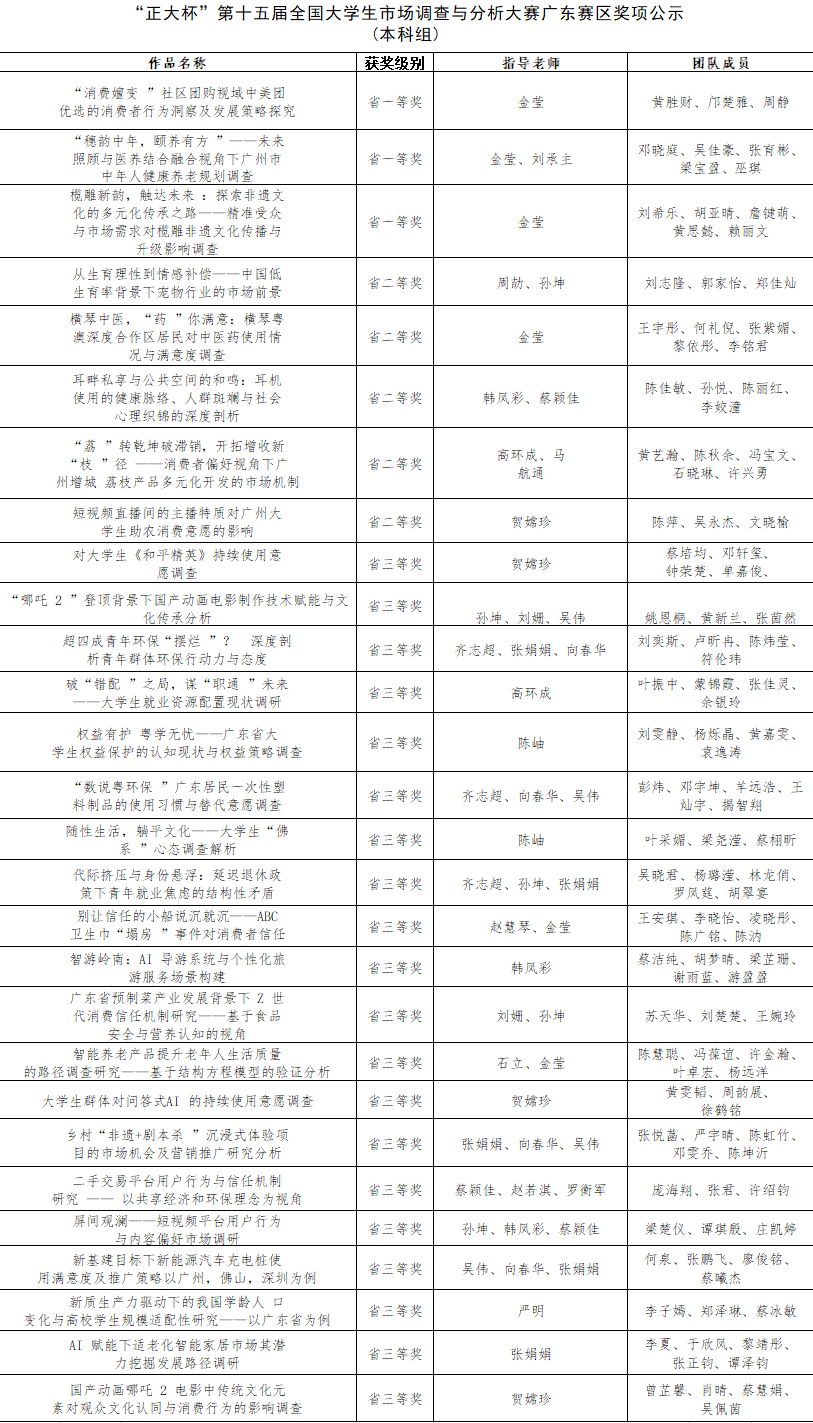 获奖层级实现全面突破。在激烈竞争中,我校团队脱颖而出,荣获省一等奖3项:聚焦“非遗传承”“智慧养老”“消费行为”等前沿课题,作品深度与创新性获评委会高度认可;荣获省二等奖5项:覆盖环保行动力、中医药发展、乡村振兴等社会热点,体现实践与理论的紧密结合;荣获省三等奖20项:从“青年就业焦虑”到“新能源汽车推广”,选题多元且紧贴时代脉搏。此外,在广东省专项赛中,我校4支队伍再添三等奖,进一步夯实了学科竞赛的“硬实力”。