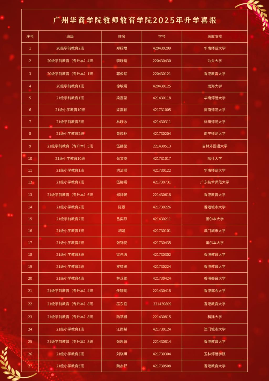 广州华商学院教师教育学院2025年毕业生考研再获佳绩。自建院以来,学院深耕学风建设,学子奋发向上。截至目前,教师教育学院2025届毕业生中共有27名同学被知名高校录取,特此向他们表示热烈祝贺!
