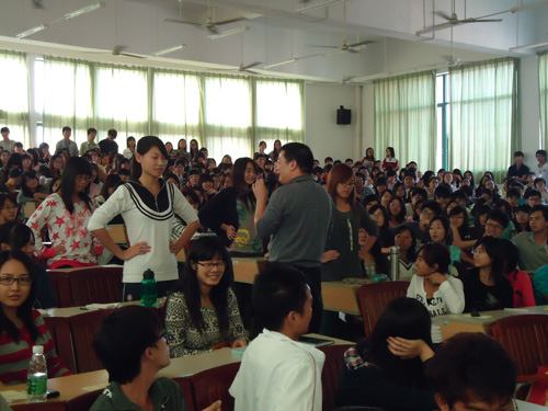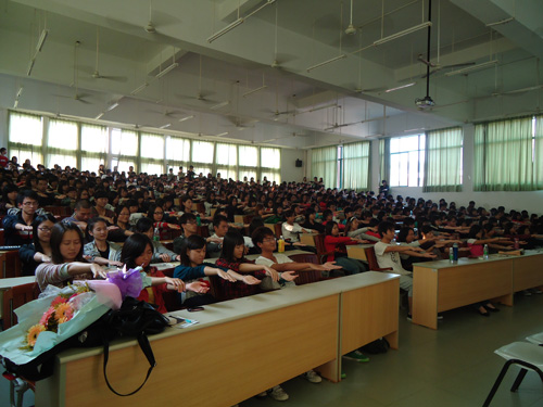 闻风而至的各班级学生一早就坐满了近400个座位的阶梯课室,讲座开始后更是全场爆满,有不少学生就站着在那听和体验。