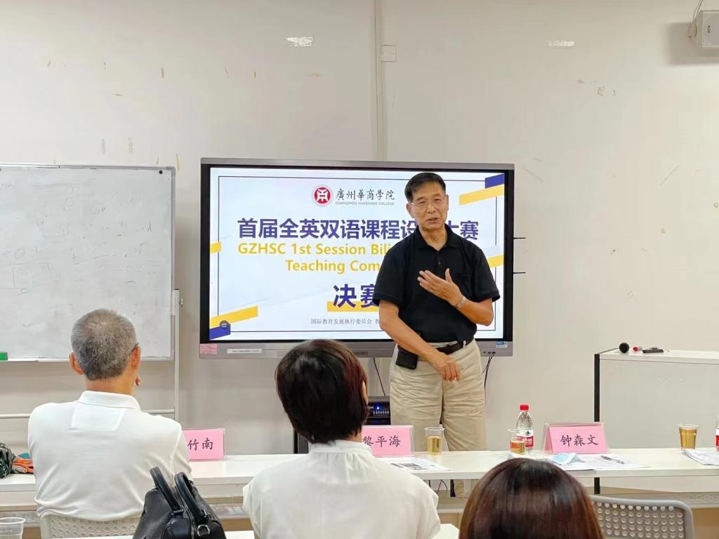 最后,广州华商学院副校长钟森文教授总结发言,充分肯定了各位老师的教学风采,他认为双语、全英教学应当落到实处,鼓励学生敢于用英语,不能降低课堂难度,而降低双语教学质量。本次比赛是一次很好的学习和交流机会,每位教师展现了各自的风采,会计学院将继续引导、激励教师进行双语教学改革,提高双语教学效果。