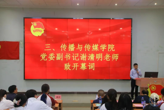 随后,谢清明老师致开幕词。他首先对嘉宾们的莅临表示欢迎和感谢,并对本次大会的召开表示热烈的祝贺。他指出,共青团组织是党的后备军,是培养德、智、体、美、劳全面发展的社会主义建设者和接班人的重要力量。他表示,传播与传媒学院的共青团组织在正确的思想指引下与学院紧密联系,层层细化各项工作。最后,谢清明老师勉励新一届团委成员应充分发挥先进青年的作用,怀热血,担大任,用青春谱写新时代的最强音。