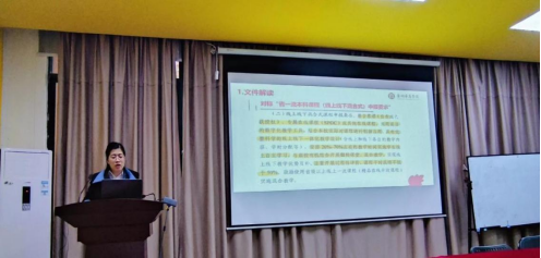 首先,由杨俏文副教授分享了省一流课程的建设与申报经验。杨老师提到一流课程申报的实质是课程建设成果的认定,其与一般项目的申报不同。然后,讲座围绕一流课程认定文件的解读、申报书的撰写、课程资源的建设、线上线下混合式教学模式下各教学环节的设计等进行了经验分享。