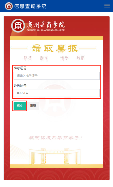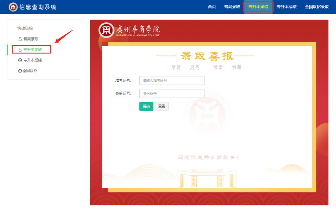 1.进入网站首页(广州华商学院招生信息网:http://zs.gdhsc.edu.cn/),点击“录取/成绩信息查询”