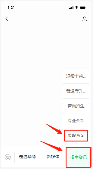 2.进入“广州华商学院招生办”公众号,点击菜单栏“招生资讯”,选择“录取查询”