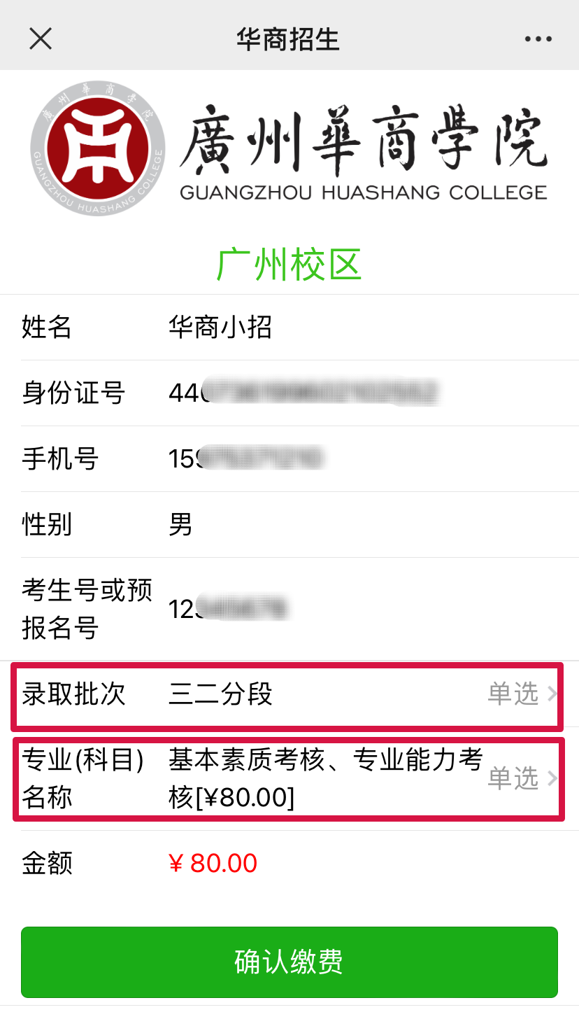 方式2.进入“广州华商学院招生办公众号”,选择菜单栏“招生资讯”—“报考费”;进入缴费页面;准确填写个人信息,点击“下一步”;选择三二分段批次及科目;核对相应金额,无误后点击“确认缴费”即可。