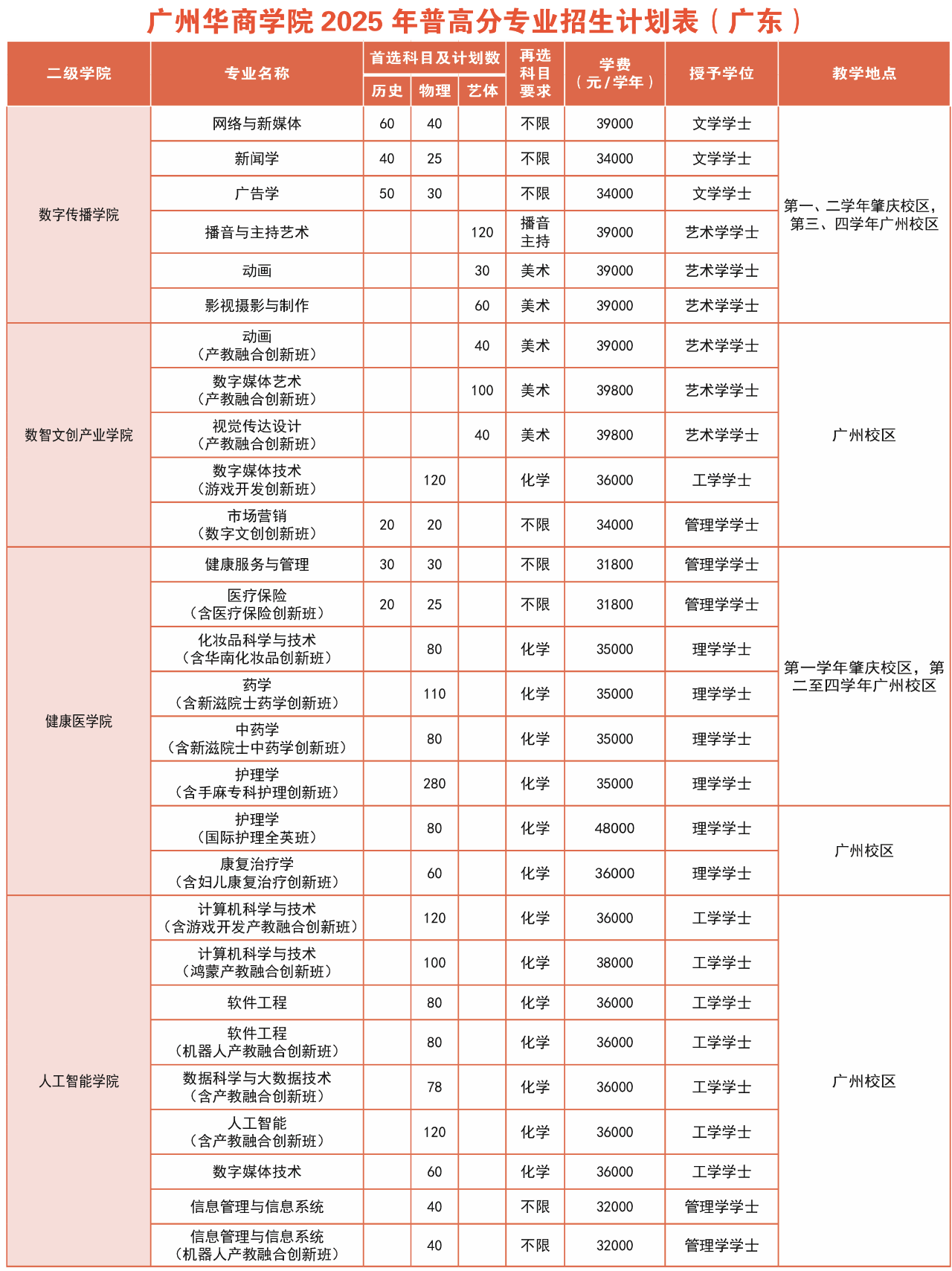 2025年,广州华商学院面向全国8个省(区)投放6300个招生计划,共开设53个本科招生专业,涵盖了经、管、文、工、艺、教、医等7大学科类。