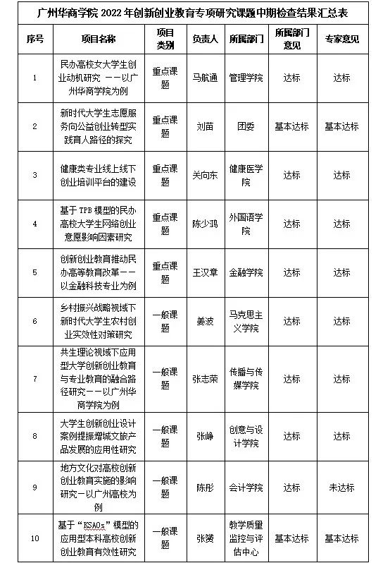 根据《广州华商学院创新创业学院关于开展2022年创新创业教育专项研究课题中期检查工作的通知》(华商创〔2022〕27号)文件要求,创新创业学院已组织开展2022年创新创业教育专项研究课题中期检查工作,共有16个项目参与中期检查。经项目所属部门自查,创新创业学院聘请专家审核、评议,有10个项目达标,5个项目基本达标,1个项目未达标,具体情况如下。