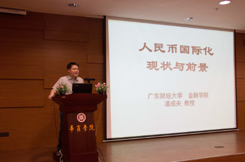 5月5日下午,由经济与金融系主办的华商学院十周年校庆学术系列活动之广东财经大学学者讲座第二场——“人民币国际化的现状与趋势”在图书馆一楼学术报告厅举行。中山大学经济学博士、广东财经大学金融学院教授潘成夫担任此次讲座的主讲人。
