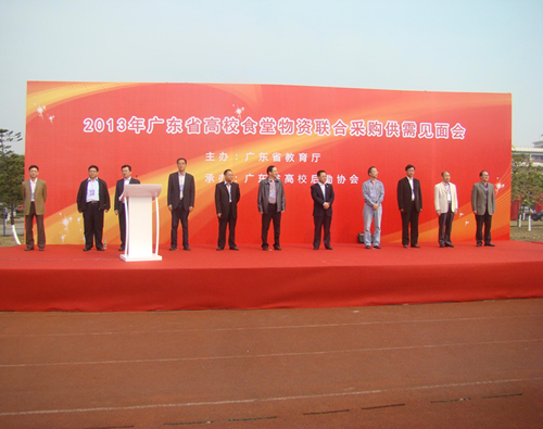 2013年高校食堂物资联合采购供需见面会于11月23日在广州大学城中大体育场隆重举行。来自全省的高校90所,校领导及后勤部门负责人近500人,及食堂物资供应商90多家参会。省教育厅副厅长、党组成员王斌伟和省食品药品监管局、省高校后勤协会的有关领导出席。