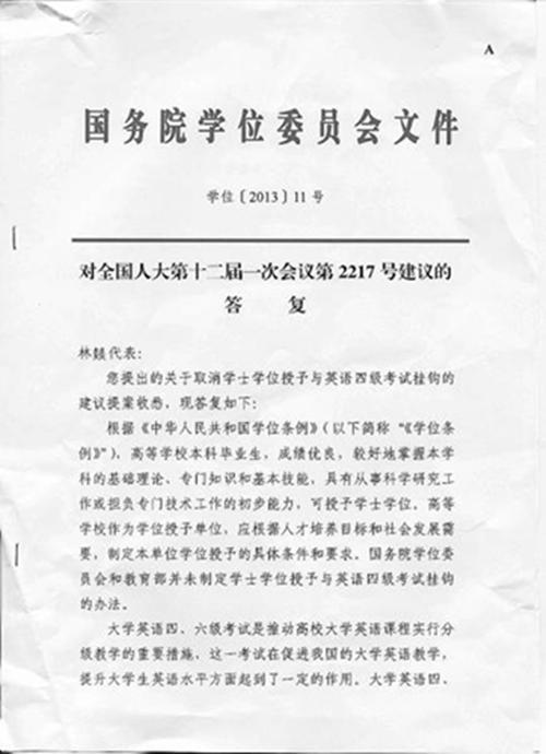 今年7月,国务院学位委员会书面答复全国人大代表林燚有关建议时重申:国务院学位委员会和教育部并未制定学士学位授予与英语四级考试挂钩的办法。
