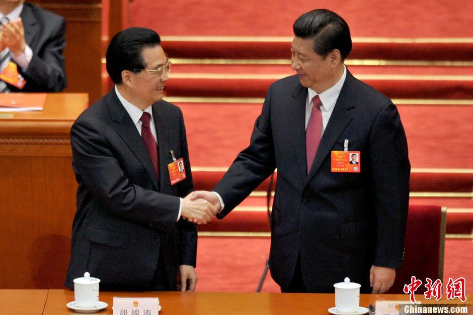 2013年3月14日,习近平当选为中华人民共和国主席。胡锦涛与习近平握手。