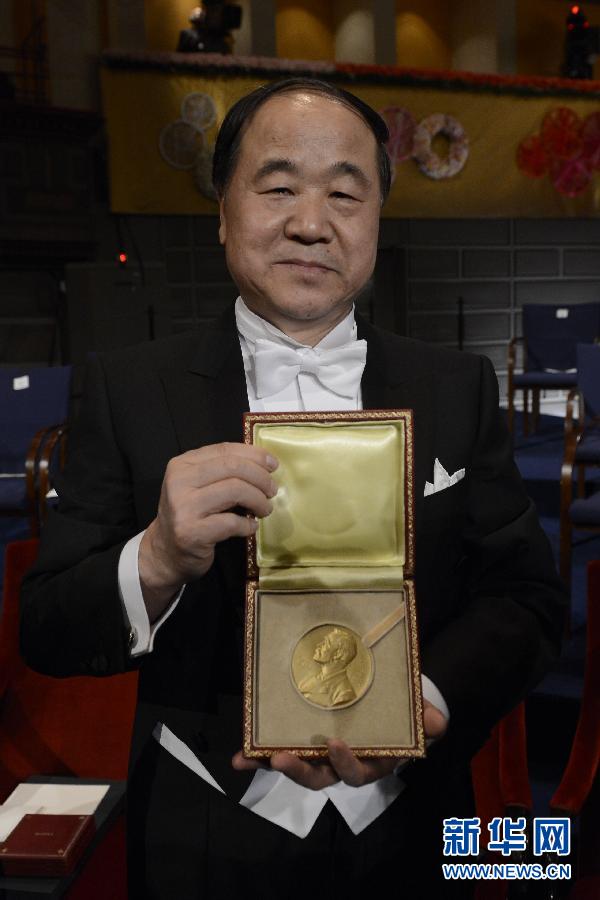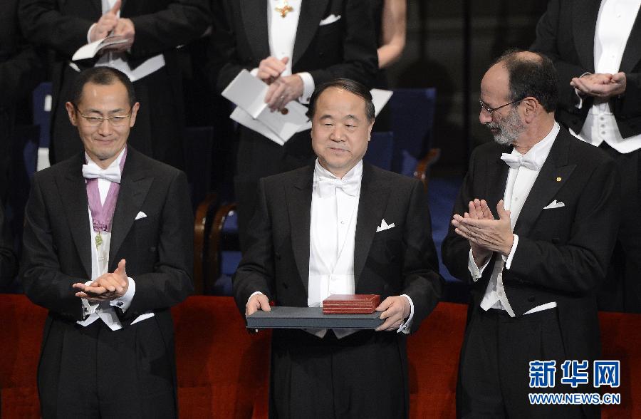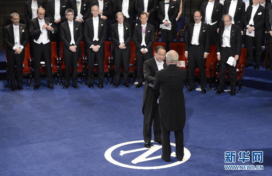 12月10日,在瑞典首都斯德哥尔摩音乐厅举行的2012年诺贝尔奖颁奖仪式上,中国作家莫言从瑞典国王卡尔十六世·古斯塔夫手中领取诺贝尔文学奖。