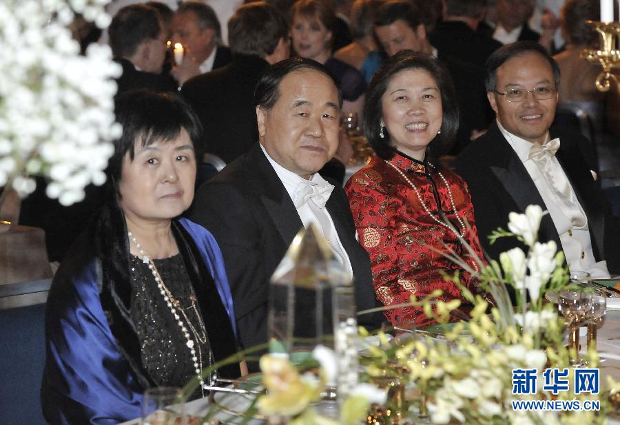 12月10日,在瑞典首都斯德哥尔摩,获颁诺贝尔文学奖的中国作家莫言(左二)与夫人杜勤兰(左一),中国驻瑞典大使兰立俊就(右一)及大使夫人顾琅琳(右二)出席诺贝尔颁奖典礼晚宴。