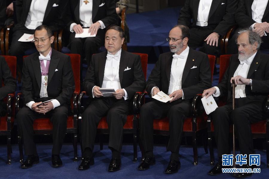 12月10日,在瑞典首都斯德哥尔摩音乐厅,2012年诺贝尔文学奖获得者、中国作家莫言(左二)出席2012年诺贝尔奖颁奖仪式。