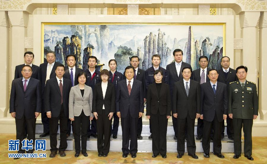 12月17日,中共中央政治局常委刘云山在北京人民大会堂会见罗阳同志先进事迹报告团成员。这是报告会前,刘云山与报告团成员合影。新华社记者 黄敬文摄