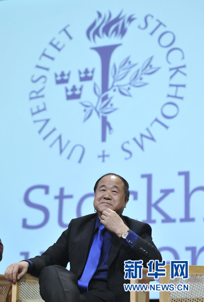 12月9日,2012年诺贝尔文学奖得主、中国作家莫言在瑞典首都斯德哥尔摩的斯德哥尔摩大学举行文学讲座。 新华社记者武巍摄