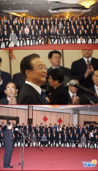 温家宝:同胞们,我对于这一次同华人、华侨的会见活动期待已久。心里感到特别的激动。我是从金边东亚峰会的会址直接坐飞机赶到华人的总部,到商会总部来的。我听说,中华侨商的总部有102年的历史,这个商会的历史其实就是我们华人、华侨为祖国和人民奋斗的历史。在这里,我要向全体的华人、华侨表示崇高的敬意和感谢。我要代表祖国和人民向全世界的华人、华侨表示问候和敬意。