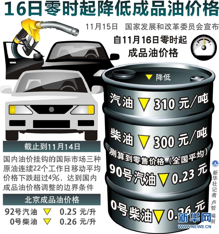 新华网北京11月15日电(记者安蓓刘铮胡俊超)中国成品油价格年内第四次下调在市场明确的预期中到来。国家发展改革委15日宣布,自16日零时起下调汽、柴油价格。