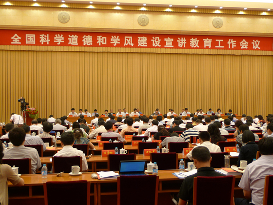 为巩固2011年科学道德和学风建设成果, 进一步推动科学道德和学风建设宣讲教育工作,6月5日,中国科协、教育部、中科院、社科院和工程院五部门在北京联合召开了全国科学道德和学风建设宣讲教育工作会议。全国人大常委会副委员长、中国科协主席韩启德,中国科协常务副主席、书记处第一书记陈希,教育部部长袁贵仁等领导同志出席会议并作重要讲话。