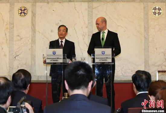 当地时间4月24日下午,中国总理温家宝在斯德哥尔摩与瑞典首相赖因费尔特举行会谈,并共同会见记者。中新社发张朔摄