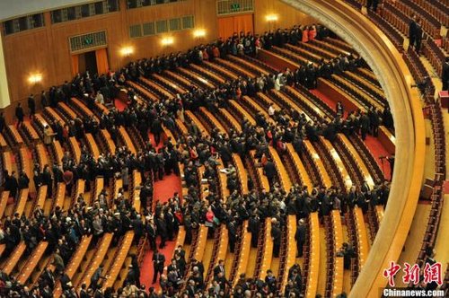 3月8日9时,十一届全国人大五次会议举行第二次全体会议,会议结束后代表们排成人龙,有序退场。中新网记者 金硕 摄