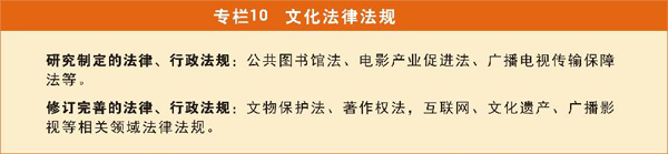 (五)法制保障。建立健全文化法律法规体系,加快文化立法,制定和完善公共文化服务保障、文化产业振兴、文化市场管理等方面法律法规,将文化建设的重大政策措施适时上升为法律法规,加强地方文化立法,提高文化建设法制化水平。
